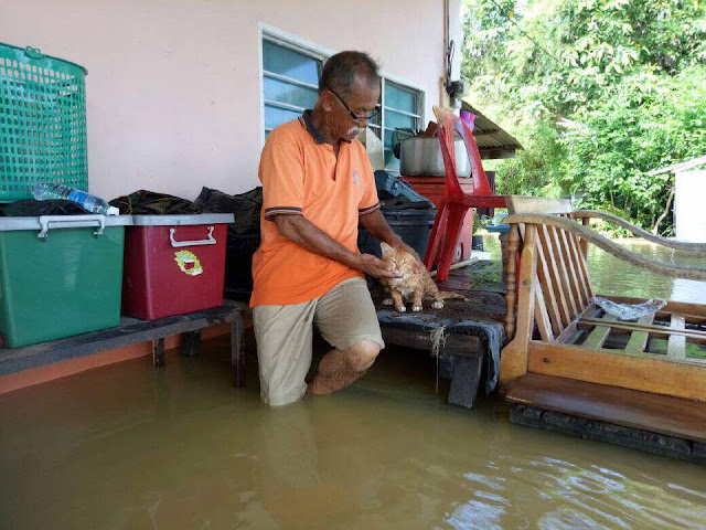 KANGAR - Sejak banjir melanda beberapa bahagian di Perlis tiga hari lalu, sudah menjadi rutin bagi Abdullah Rahman, 65, untuk berulang dari pusat pemindahan ke rumahnya tiga kali setiap hari semata-mata untuk memberi makan kucing kesayangannya 'Oye'.